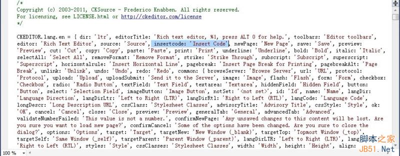 最后一步:進入"ckeditor\lang",請注意是分別在"en.js","zh.js","zh-cn.js"中增加",insertcode:'Insert Code'",",insertcode:'插入代碼'",",insertcode:'插入代碼'",一定要按這個順序加哦。