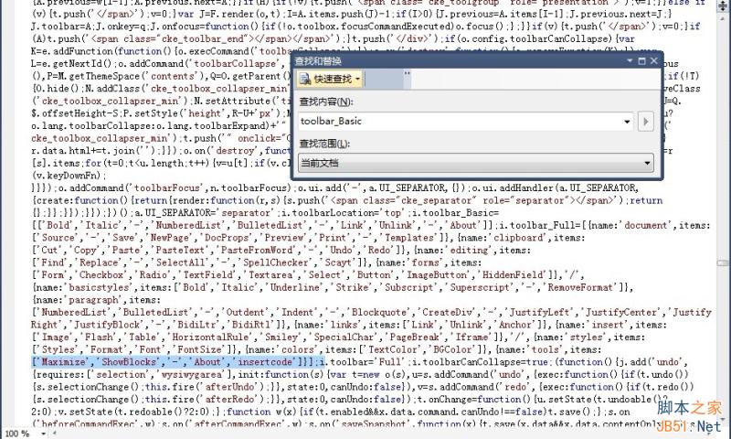 接下來繼續(xù)在ckeditor.js查找"i.toolbar_Basic=",這就是CKEditor默認的工具欄了,我們在這里加上",insertcode",比如我的"['Maximize','ShowBlocks','-','insertcode']"