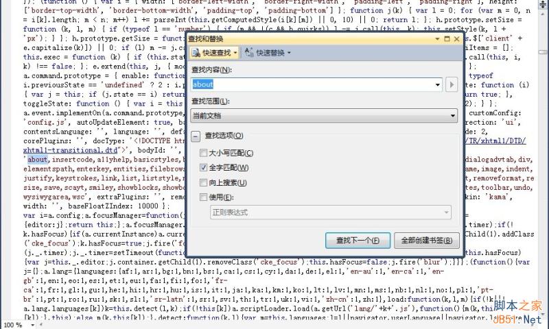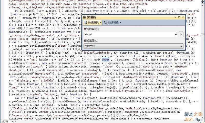 繼續(xù)查找"about",找到"j.add('about',{init:function(l){var m=l.addCommand('about',new a.dialogCommand('about'));m.modes={wysiwyg:1,source:1};m.canUndo=false;l.ui.addButton('About',{label:l.lang.about.title,command:'about'});a.dialog.add('about',this.path+'dialogs/about.js');}});",我們在這個分號后面增加"j.add('insertcode', {requires: ['dialog'],init: function(l){l.addCommand('insertcode', new a.dialogCommand('insertcode'));l.ui.addButton('insertcode', {label: l.lang.insertcode.toolbar,command: 'insertcode',icon: this.path + 'images/code.jpg'});a.dialog.add('insertcode', this.path + 'dialogs/insertcode.js');}});"。