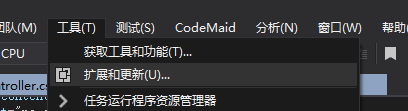 6. 在Visual Studio 2017折菜單中點擊“工具”的“擴(kuò)展與更新”。其他版本的Visual Studio中也是類似菜單。如下圖。