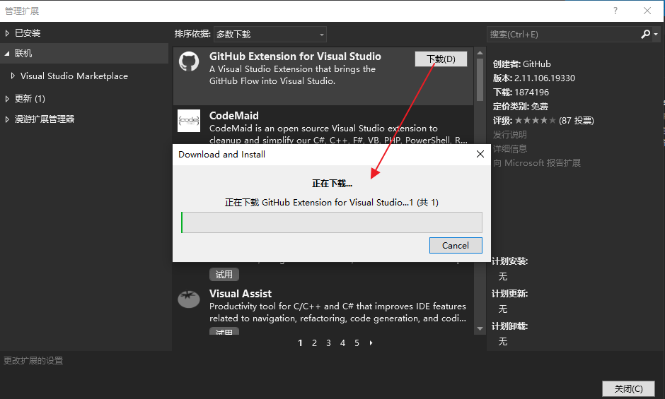 9. 如果你無法通過第5至第7步中的方法進(jìn)行安裝,你可以直接到https://marketplace.visualstudio.com/items?itemName=GitHub.GitHubExtensionforVisualStudio下載插件包,如下圖。然后進(jìn)行安裝。