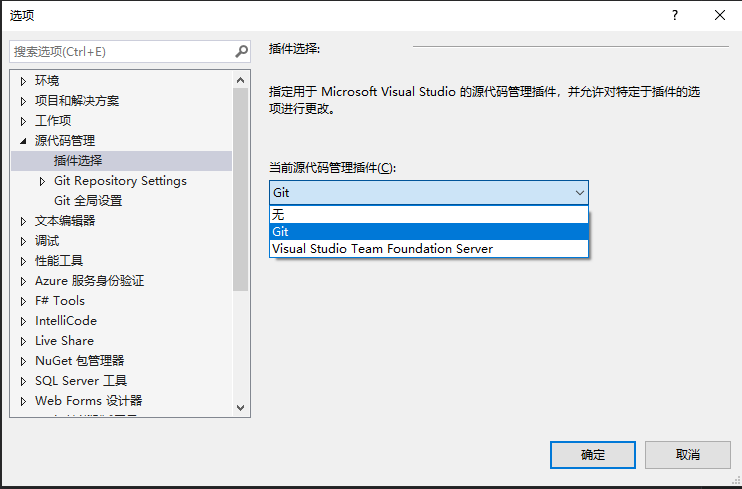 8. 然后點擊vs菜單的“工具”的“選項”,展開左側(cè)的“源代碼管理(Source Control)”,在右側(cè)的“當(dāng)前源代碼管理插件”中選擇“Git”,然后點擊“確定”。如下圖。