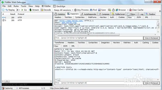 訪問百度的首頁,在fiddler中可以看到完成的請(qǐng)求和響應(yīng)數(shù)據(jù)