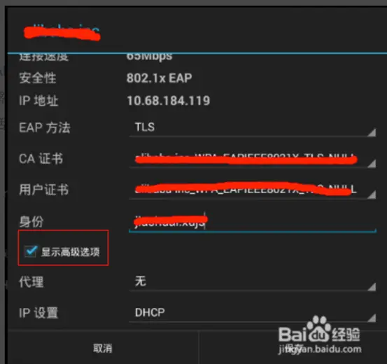 ->“WLAN”,找到你要連接的網(wǎng)絡(luò),在上面長(zhǎng)按,然后選擇“修改網(wǎng)絡(luò)”,彈出網(wǎng)絡(luò)設(shè)置對(duì)話框,然后勾選“顯示高級(jí)選項(xiàng)”