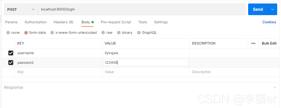 請(qǐng)求地址:http://localhost:8000/login?username=liyingxiapassword=123456