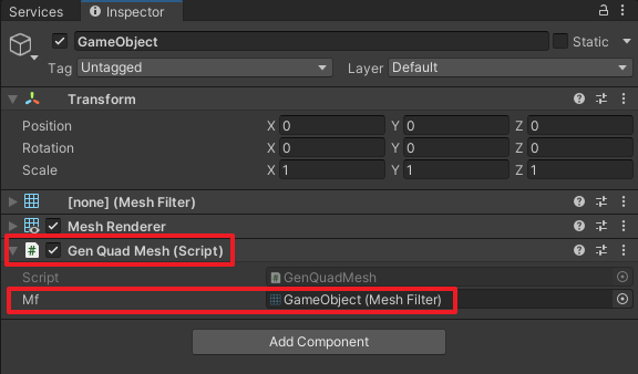 再掛上我們上面寫的GenQuadMesh腳本,賦值mf變量為MeshFilter對象,如下