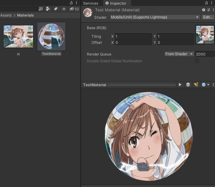 上面之所以顯示紫色塊,是因為我們沒有給MeshFilter設(shè)置材質(zhì)球,順手做一個炮姐的材質(zhì)球吧,