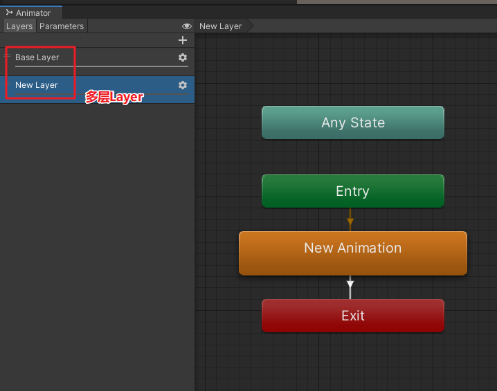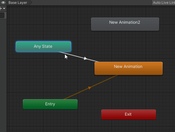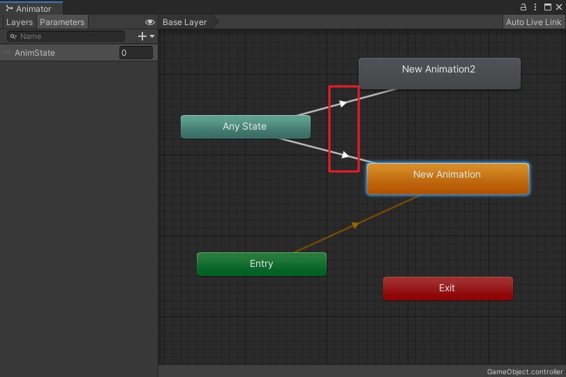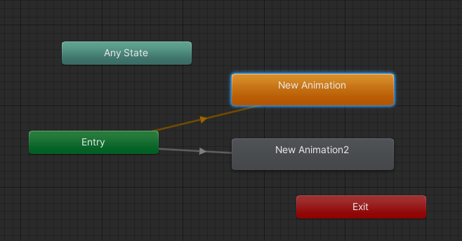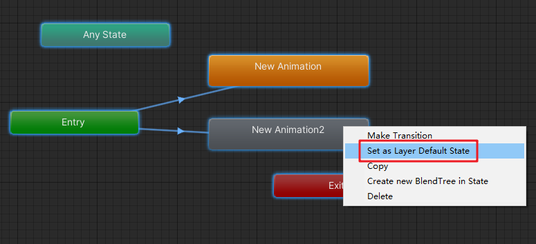 上面的代碼,讓AnimState這個參數(shù)值為0,滿足了從Any State到New Animation2的過渡條件,從而實現(xiàn)New Animation2動畫的過渡。