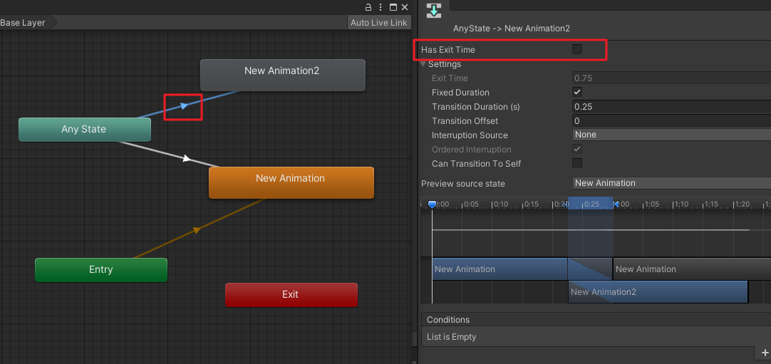Has Exit Time,如果勾選了,則表示在該動作完成后才允許切換,