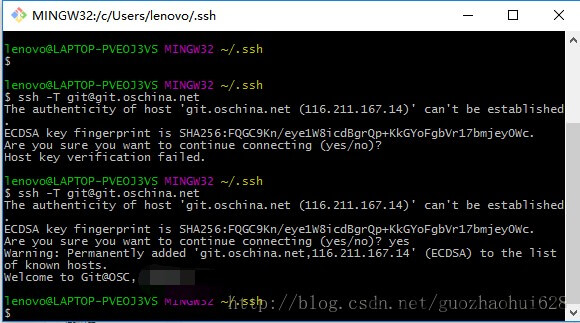 F. 驗證ssh,因為不驗證有時候會出問題,所以為了保證,我們還是需要驗證下,同樣隨便找個地方,進(jìn)入后輸入ssh -T git@git.oschina.net , 會提示你這個鏈接的碼云不確定,問我們要不要急需鏈接,我們輸入 yes ,然后提示你 welcome ,則表示我們成功。如圖: