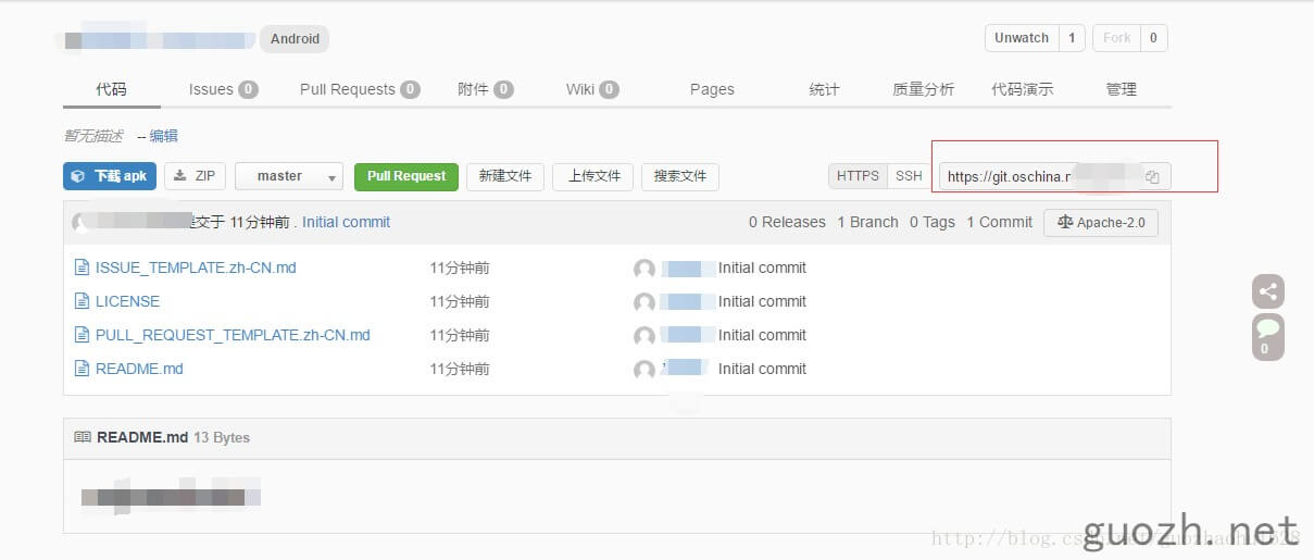 創(chuàng)建后進(jìn)入倉庫,可以看到我們大致的信息,最主要的可以看到我們的鏈接地址,如圖: