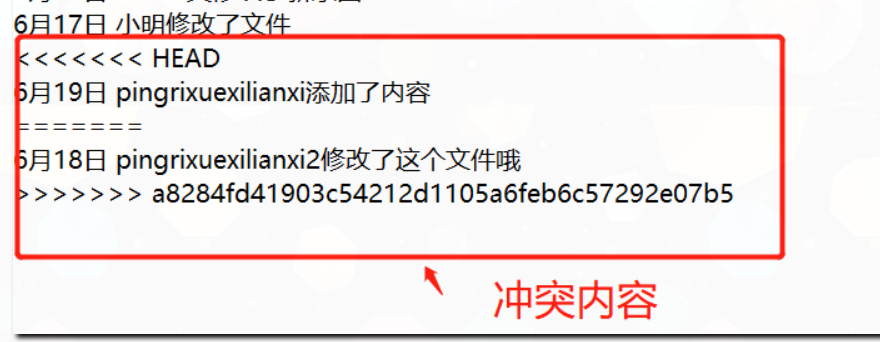 HEAD到 =======里面的【6月19日 pingrixuexilianxi添加了內(nèi)容】是自己剛才的Commit提交的內(nèi)容=======到 >>>>>>> a8284fd41903c54212d1105a6feb6c57292e07b5里面的【6月18日 pingrixuexilianxi2修改了這個文件哦】是遠(yuǎn)程代碼庫更新的內(nèi)容(即為pingrixuexilianxi2本地代碼庫推送修改內(nèi)容)。手動沖突解決方法根據(jù)項目需求刪除不需要的代碼就行了,假如都需要的話我們只需要把 HEAD======= >>>>>>> a8284fd41903c54212d1105a6feb6c57292e07b5都刪掉沖突就解決了(注意,在項目中最后這些符號都不能存在,否則可能會報異常)?;蛘呖梢允褂胓it可視化管理工具(推薦)