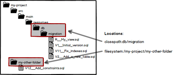 Migrations是指Flyway在更新數(shù)據(jù)庫時是使用的版本腳本,比如:一個基于Sql的Migration命名為V1__init_tables.sql,內(nèi)容即是創(chuàng)建所有表的sql語句,另外,F(xiàn)lyway也支持基于Java的Migration。Flyway加載Migrations的默認(rèn)Locations為classpath:db/migration,也可以指定filesystem:/project/folder,其加載是在Runtime自動遞歸地執(zhí)行的。