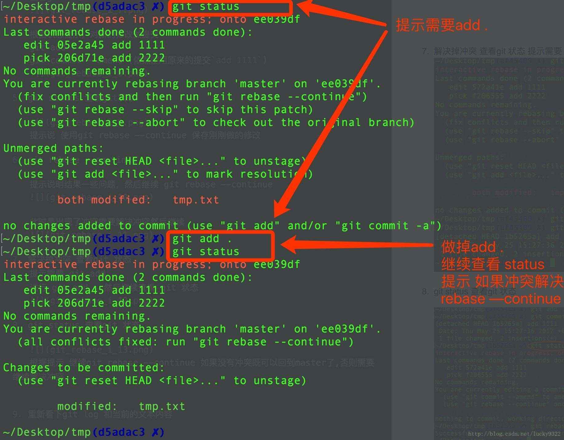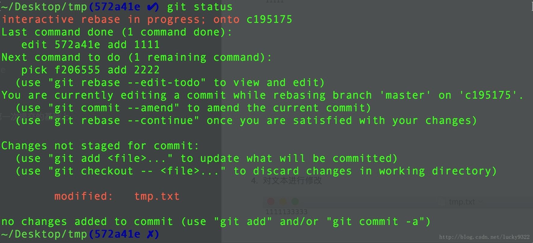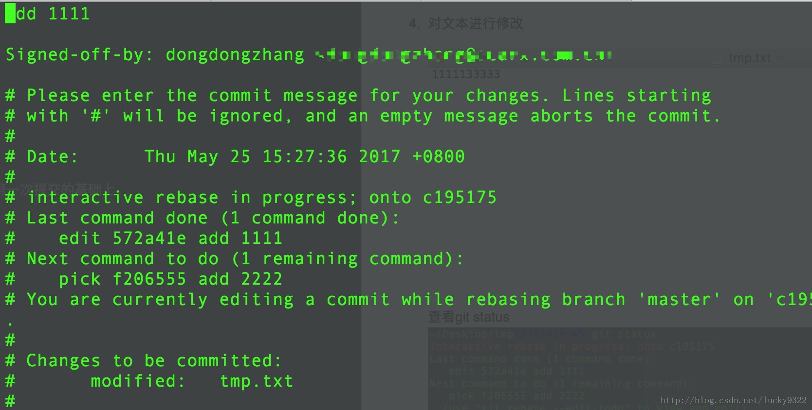 提示說 使用git rebase –continue 保存剛剛做的修改