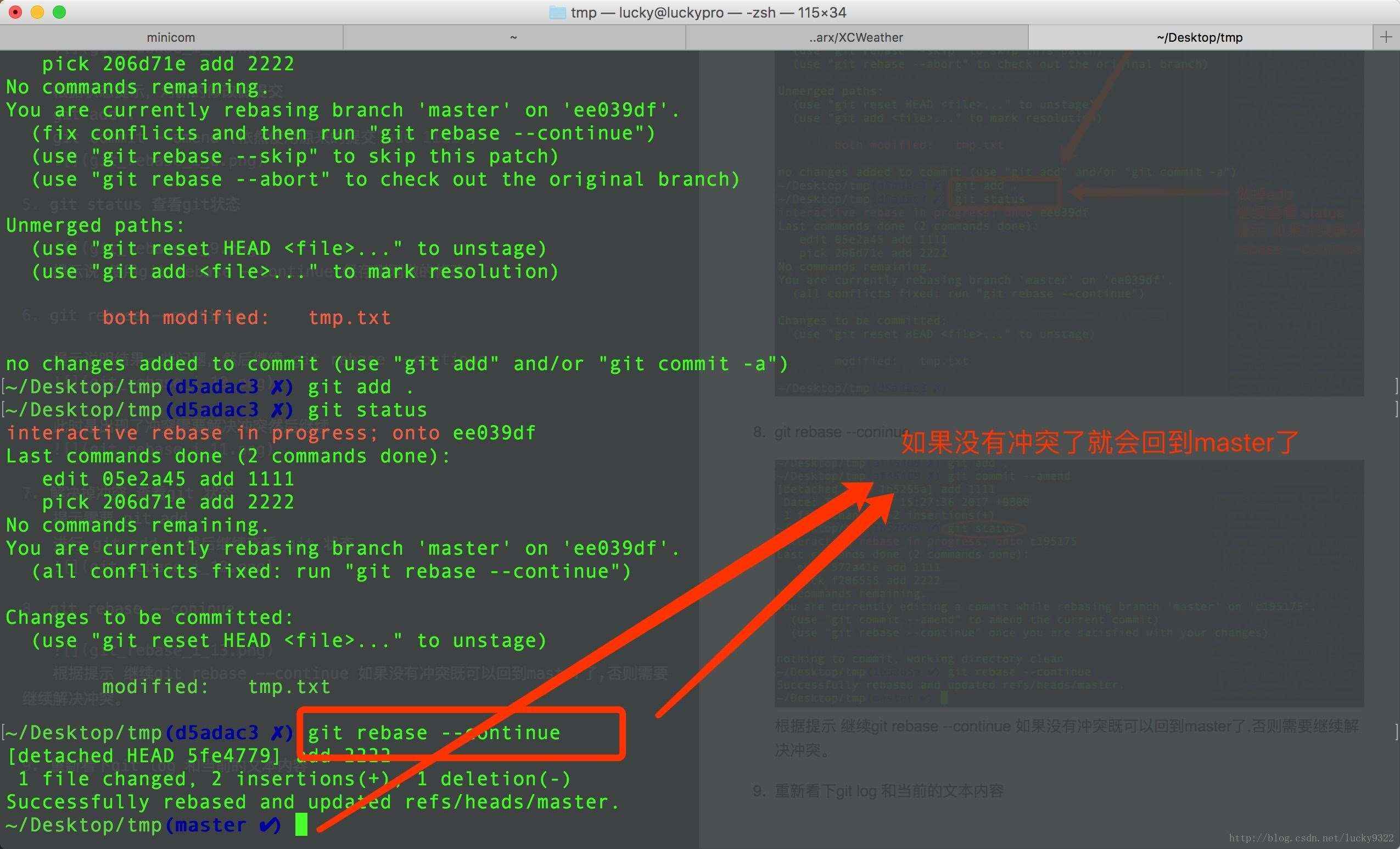 根據(jù)提示 繼續(xù)git rebase –continue 如果沒有沖突既可以回到master了,否則需要繼續(xù)解決沖突。