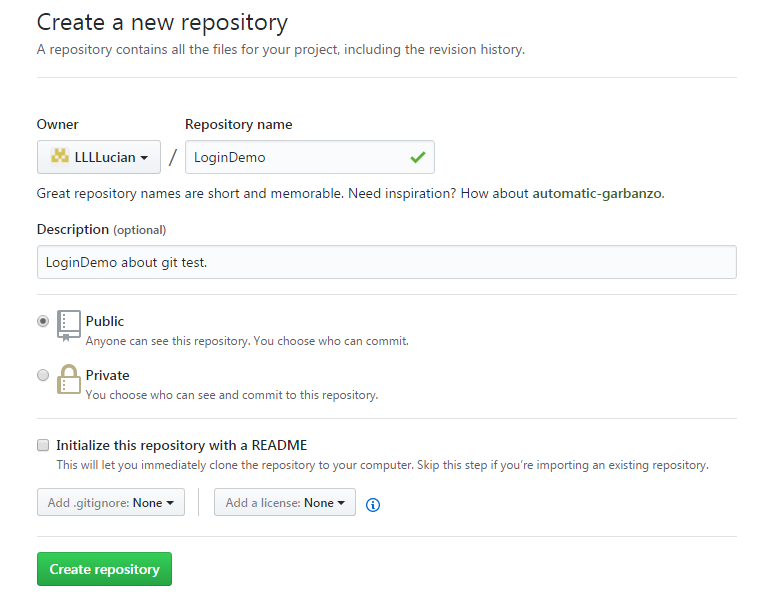 首先,我們需要在有一個自己的github帳戶,然后在github上新建一個repository,名字也叫做LoginDemo(可以和本地項目名不一樣)。