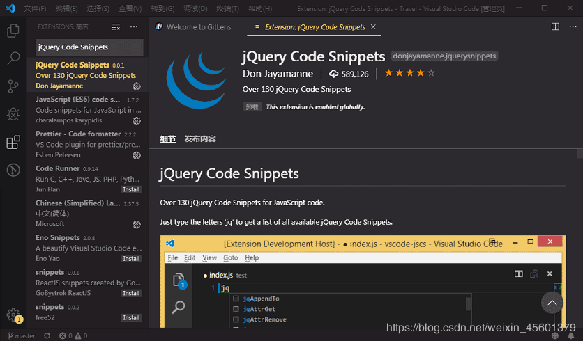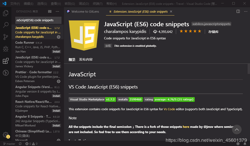 3.10 JavaScript(ES6) code snippets(ES6語法智能提示,以及快速輸入)