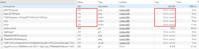 當(dāng)瀏覽器對(duì)某個(gè)資源的請(qǐng)求命中了強(qiáng)緩存時(shí),返回的http狀態(tài)為200,在chrome的開發(fā)者工具的network里面size會(huì)顯示為from cache,比如京東的首頁(yè)里就有很多靜態(tài)資源配置了強(qiáng)緩存,用chrome打開幾次,再用f12查看network,可以看到有不少請(qǐng)求就是從緩存中加載的: