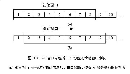 滑動(dòng)窗口技術(shù)是簡(jiǎn)單的帶重傳的肯定確認(rèn)機(jī)制的一個(gè)更復(fù)雜的變形,它允許發(fā)送方在等待一個(gè)確認(rèn)信息之前可以發(fā)送多個(gè)分組。如圖 3-7所示,發(fā)送方要發(fā)送一個(gè)分組序列,滑動(dòng)窗口協(xié)議在分組序列中放置一個(gè)固定長(zhǎng)度的窗口,然后將窗口內(nèi)的所有分組都發(fā)送出去;當(dāng)發(fā)送方收到對(duì)窗口內(nèi)第一個(gè)分組的確認(rèn)信息時(shí),它可以向后滑動(dòng)并發(fā)送下一個(gè)分組;隨著確認(rèn)的不斷到達(dá),窗口也在不斷的向后滑動(dòng)。