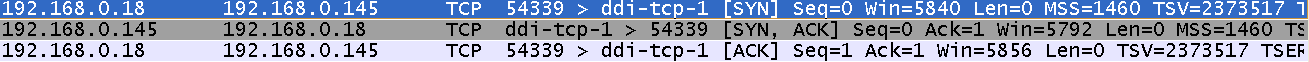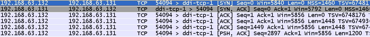 前三次是三次握手的過程,后面三次是傳送數(shù)據(jù)的過程,由于數(shù)據(jù)大小是4096個(gè)字節(jié),所以用了三次進(jìn)行傳遞(1448 + 1448 + 1200)。細(xì)心的人會(huì)問為什么每次傳送的最大數(shù)據(jù)大小不是1460個(gè)字節(jié)呢?因?yàn)檫@里的TCP攜帶可選項(xiàng),TCP頭長(zhǎng)度 = 20 + 12(可選選項(xiàng)大?。?= 32字節(jié)。 這樣能傳輸?shù)淖畲髷?shù)據(jù)為:1500 - 20 - 32 = 1448個(gè)字節(jié)。