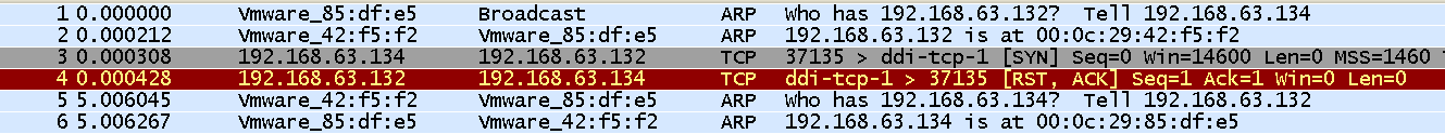 可以看到host:192.168.63.134向host:192.168.63.132發(fā)起連接請(qǐng)求,但是host:192.168.63.132并沒有處于監(jiān)聽對(duì)應(yīng)端口的服務(wù)器端,這時(shí)