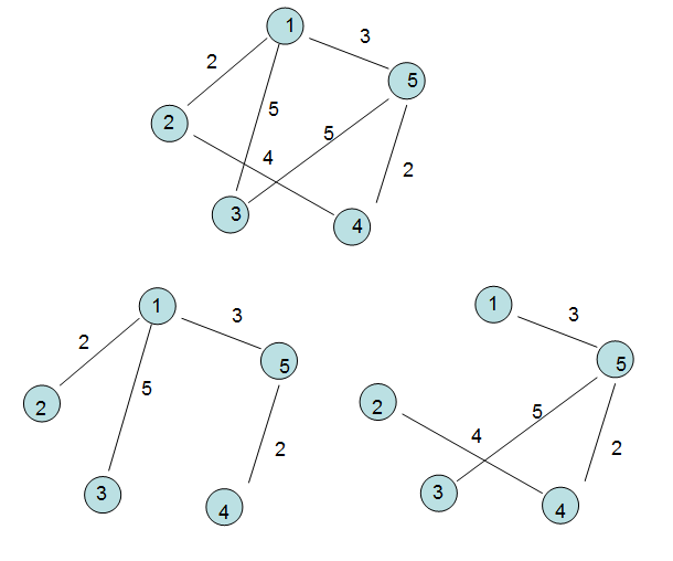 其實(shí)一句話總結(jié)就是:生成樹是將原圖的全部頂點(diǎn)以最小的邊連通的子圖,這不,如下的連通圖可以得到下面的兩個(gè)生成樹。