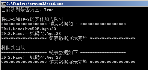 queueManage.SeqQueueIn(seqQueue, new Student() { ID = 2, Name = "一線碼農(nóng)", Age = 23 });
