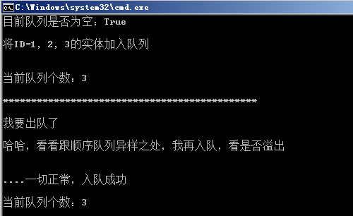 Console.WriteLine("哈哈,看看跟順序隊列異樣之處,我再入隊,看是否溢出\n");