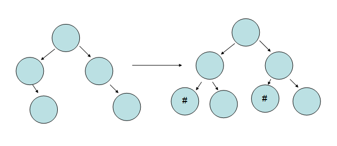 “完全二叉樹(shù)”,那我們就麻煩了,必須將其轉(zhuǎn)化為“完全二叉樹(shù)”,將空的節(jié)點(diǎn)可以用“#”代替,圖中也可看出,為了維護(hù)