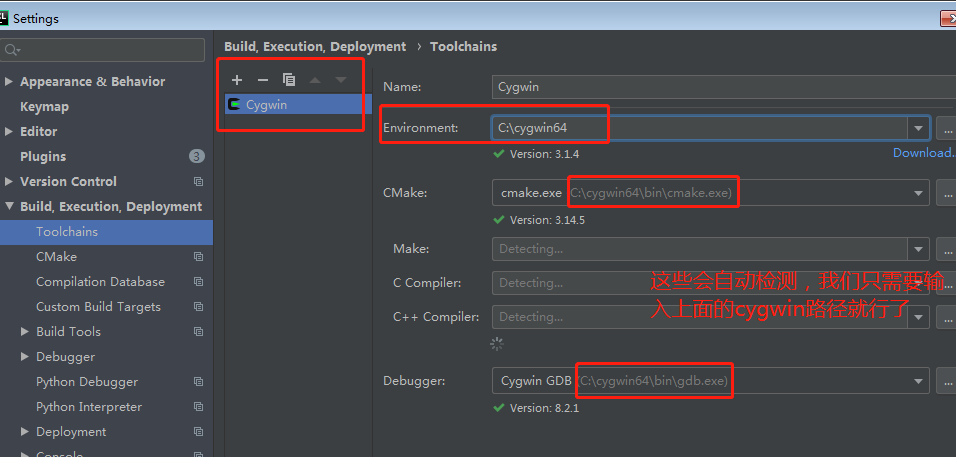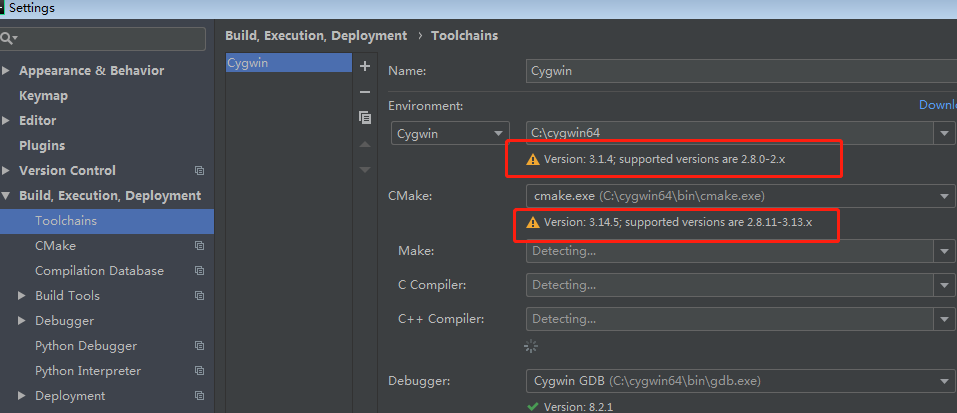 clion為啥要依賴cygwin,因?yàn)閏lion只是個(gè)ide,具體的代碼編譯之類的,還是要gcc、cmake這些來做的,我給大家看下,我一開始下載的2018.3版本,配置了我的cygwin之后,提示如下:
