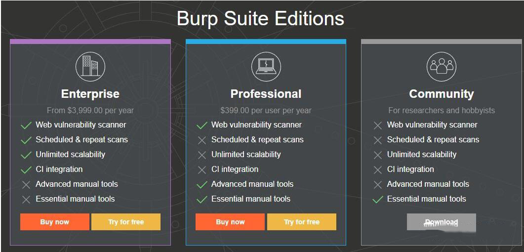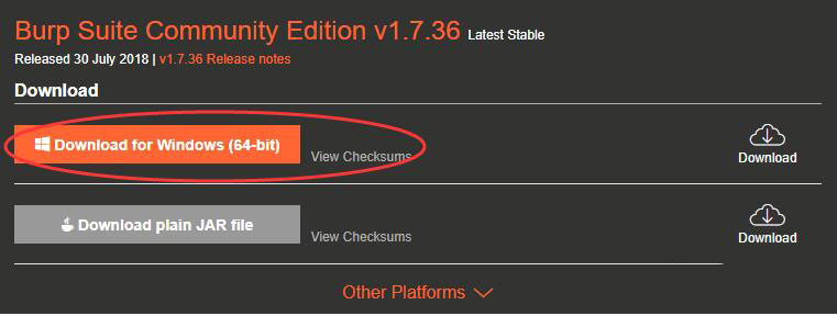 Burp Suite工具安裝下載地址:https://portswigger.net/burp/版本區(qū)分為社區(qū)版本和職業(yè)版本。Burp Suite工具支持不同的操作系統(tǒng)安裝(windows/mac os/linux平臺(tái)等)下載首頁如圖所示: