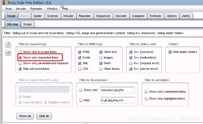 可以選擇只顯示有回顯的數(shù)據(jù)或網(wǎng)站,勾上下面紅框框住的選項就可以了。如果只選擇當(dāng)前需要的一個網(wǎng)站,勾選Show only in-scope items。