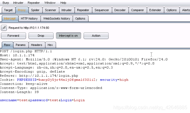 打開burpsuite,點擊proxy——Options勾選127.0.0.1:8080。在Intercept點擊后顯示Intercept on,啟動。