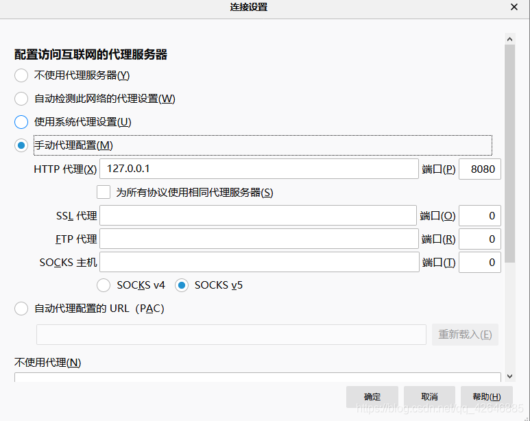 以firefox火狐瀏覽器為例:點擊選項——高級——網(wǎng)絡(luò)——設(shè)置——選擇手動配置代理,HTTP代理輸入:127.0.0.1端口:8080