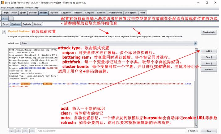2:Positions 設(shè)置Payloads的插入點(diǎn)以及攻擊類型(攻擊模式)。
