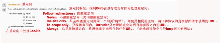選項7:Redirections 重定向響應(yīng),控制Burp在進(jìn)行攻擊時如何處理重定向。