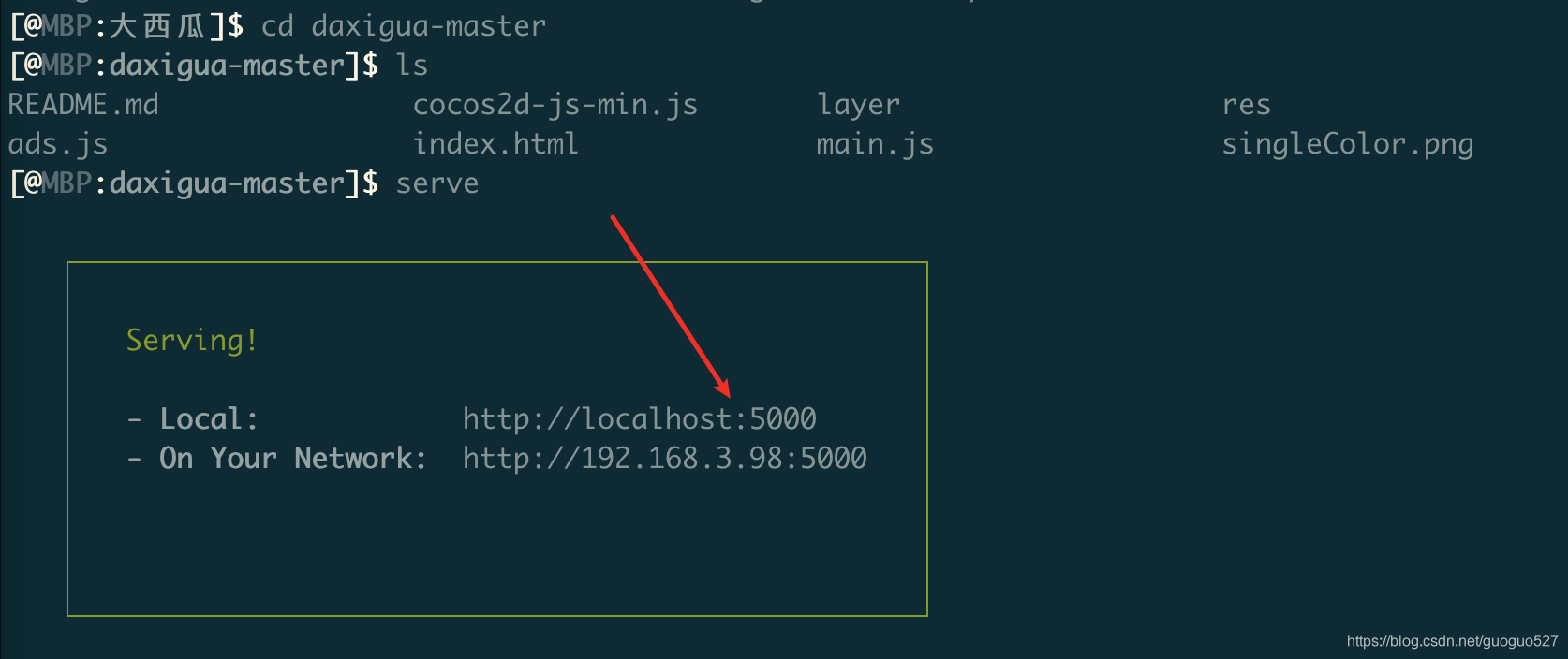 通過(guò)終端命令行cd 進(jìn)入到上面下載的游戲源碼中,直接執(zhí)行 serve 命令就可以啟動(dòng)服務(wù)了,如下圖所示: