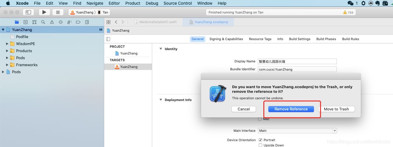 到xcode里面打開workspace文件,然后選中項(xiàng)目文件,按刪除鍵,delete,選擇Remove Reference,這個(gè)是刪除引用,但是不刪除文件,然后,再把這個(gè)文件,拖動(dòng)到xcode的workspace里