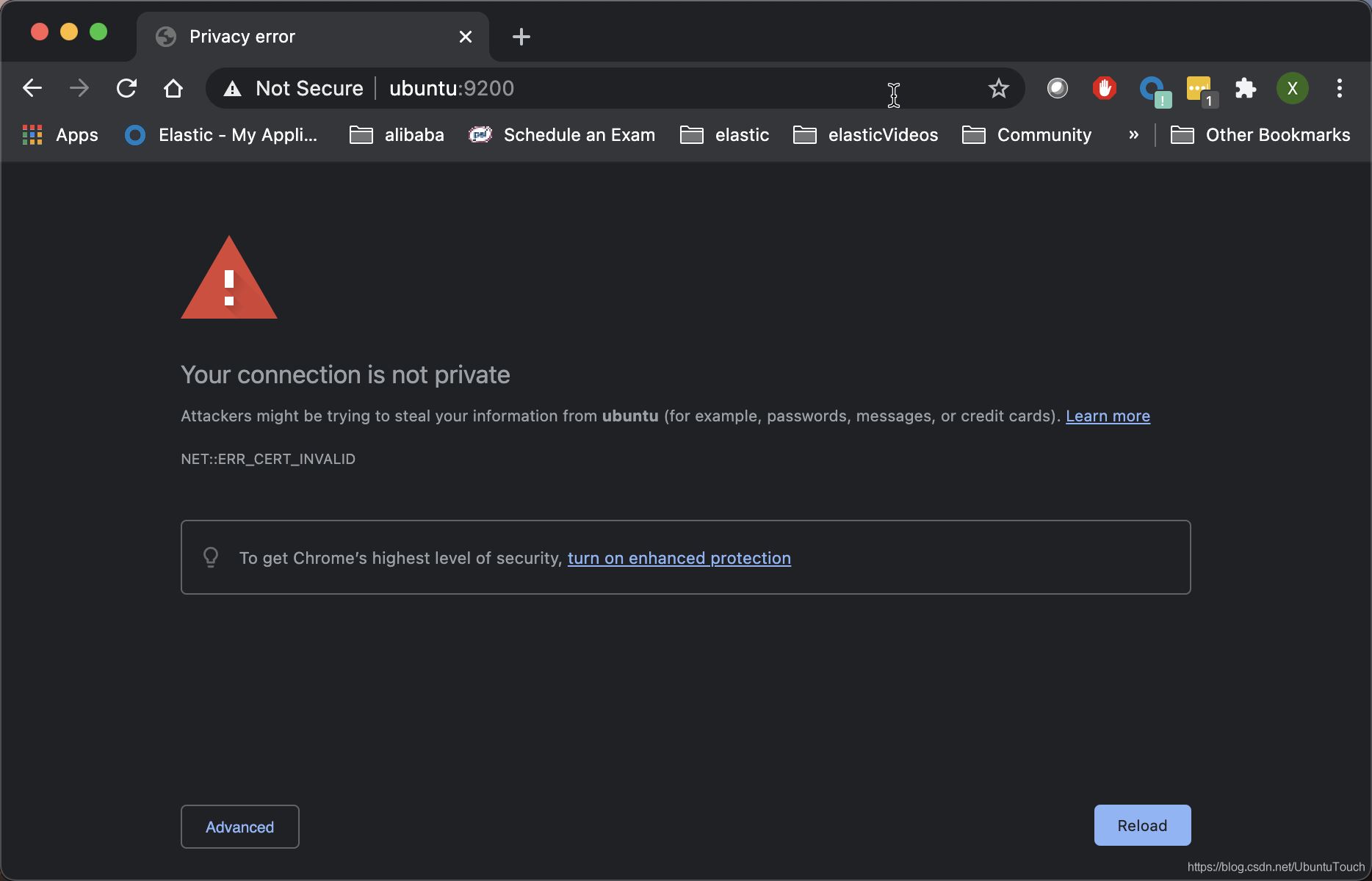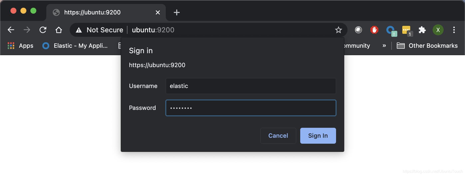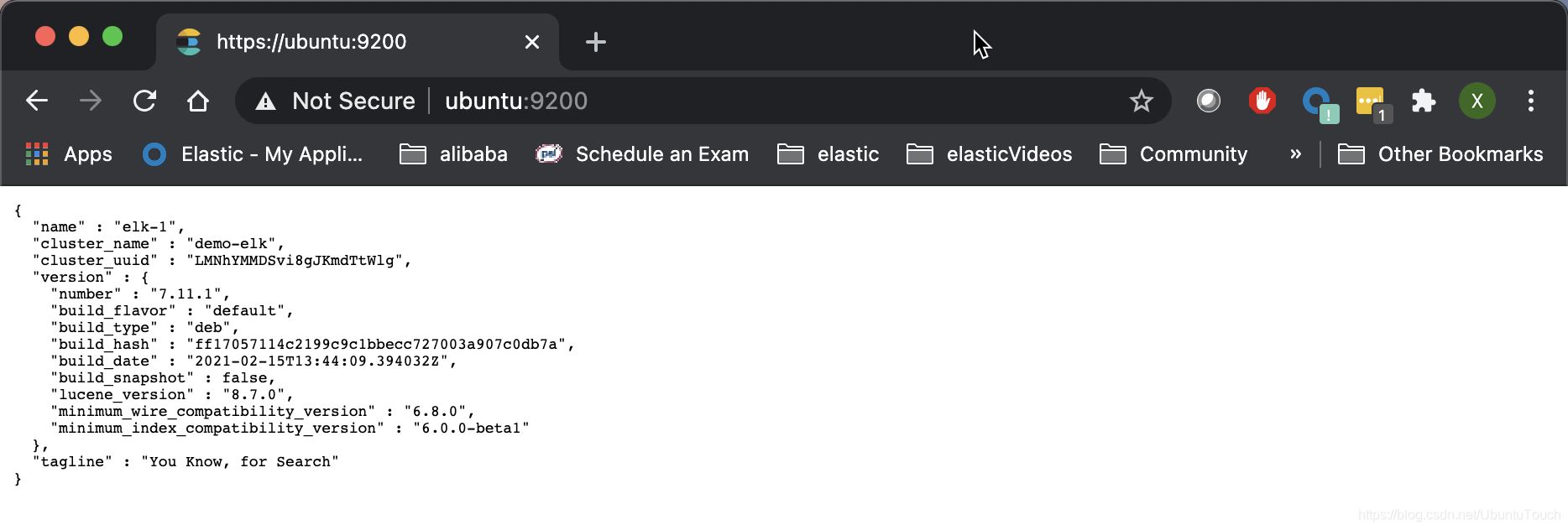 我們可以通過另外一個機器來訪問 ubuntu 機器 https://ubuntu.9200。當(dāng) Chrome 瀏覽器上出現(xiàn)如下的畫面時: