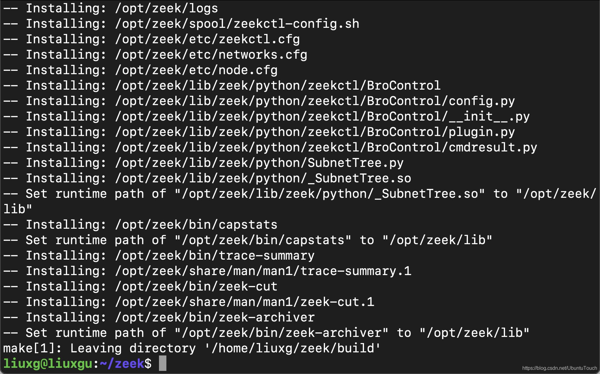 在上面,我們假設(shè)你把 zeek 的文件 clone 到 home 目錄下的 zeek 目錄。現(xiàn)在,我們準(zhǔn)備安裝 Zeek,運行以下 make 命令,然后將其保留安裝(這可能需要一些時間)