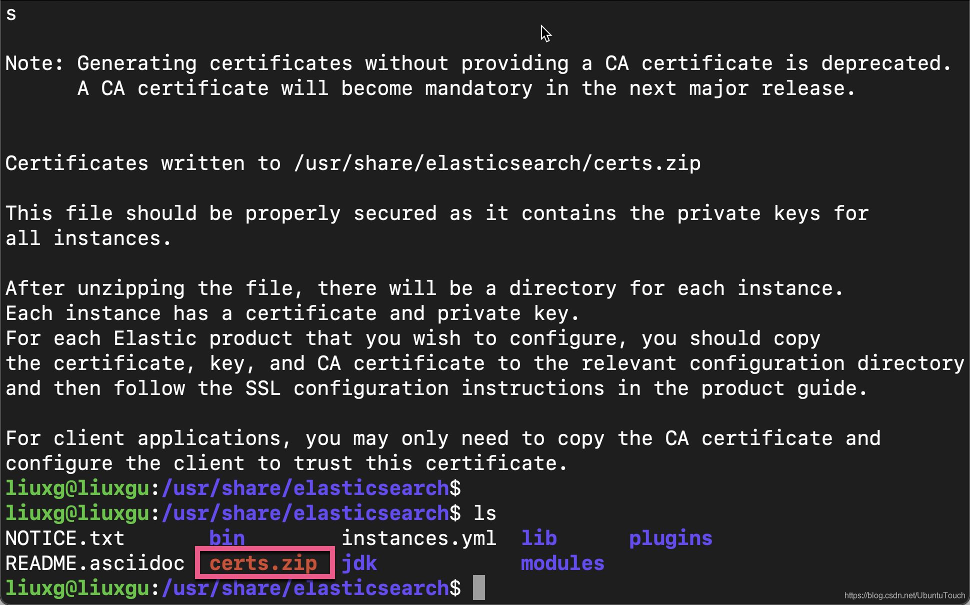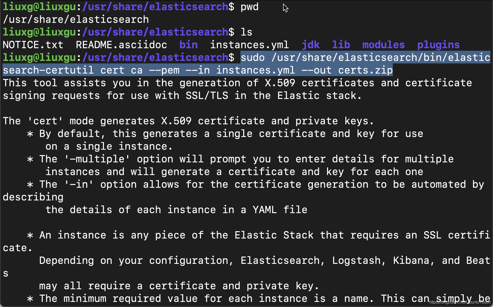 /usr/share/elasticsearch/bin/elasticsearch-certutil cert ca --pem --in instances.yml --out certs.zip