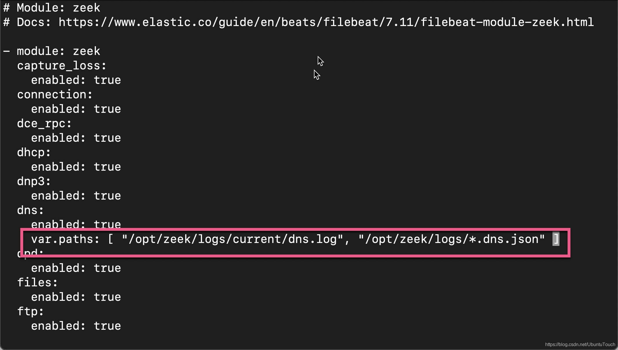 var.paths: [ "/opt/zeek/logs/current/dns.log", "/opt/zeek/logs/*.dns.json" ]