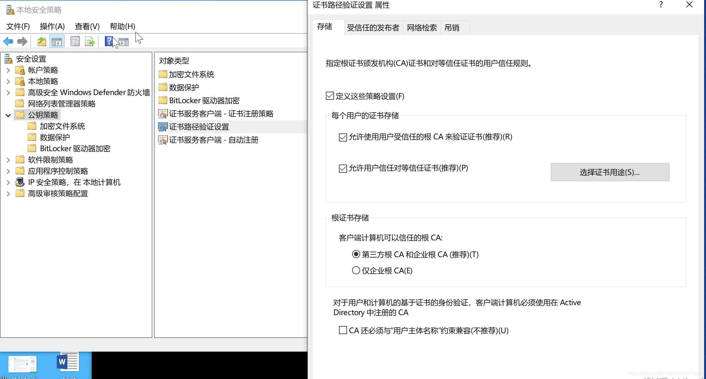然后,選中“定義這些策略設(shè)置”,然后選中 “允許使用用戶信任的根CA來驗證證書” 和 “允許用戶信任對等信任證書” 選項(如果尚未選中)。
