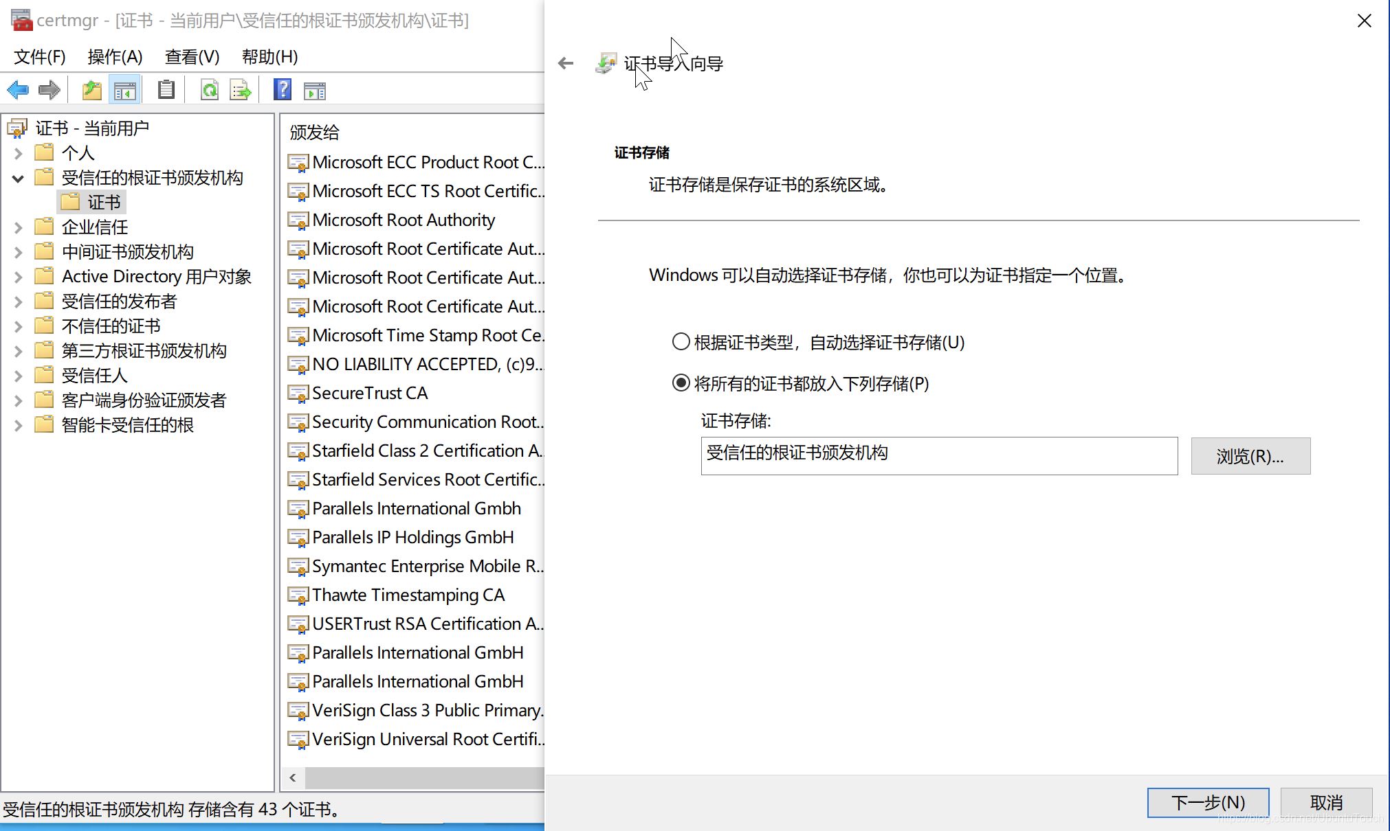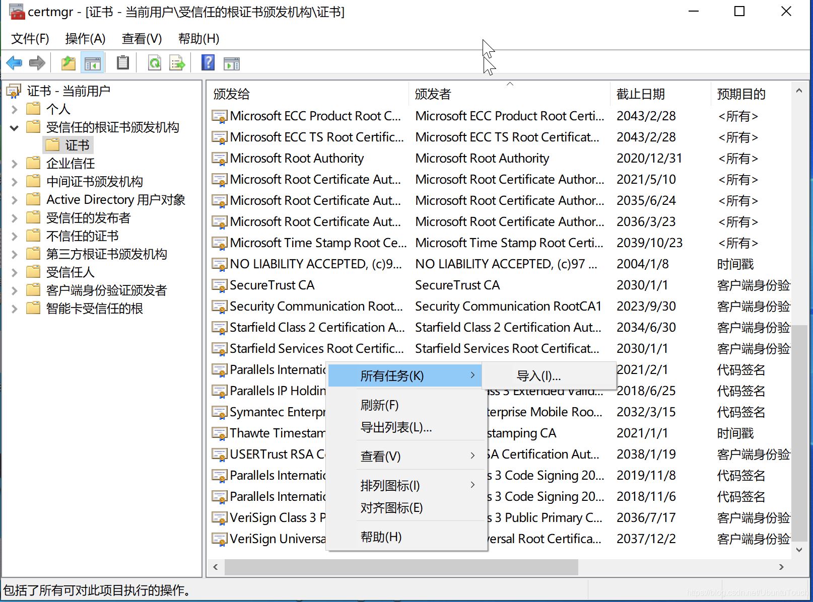 然后轉(zhuǎn)到 “受信任的根證書頒發(fā)機構(gòu)” > “證書”,右鍵單擊空白處的任意位置,然后選擇 “所有任務(wù)” > “導(dǎo)入”