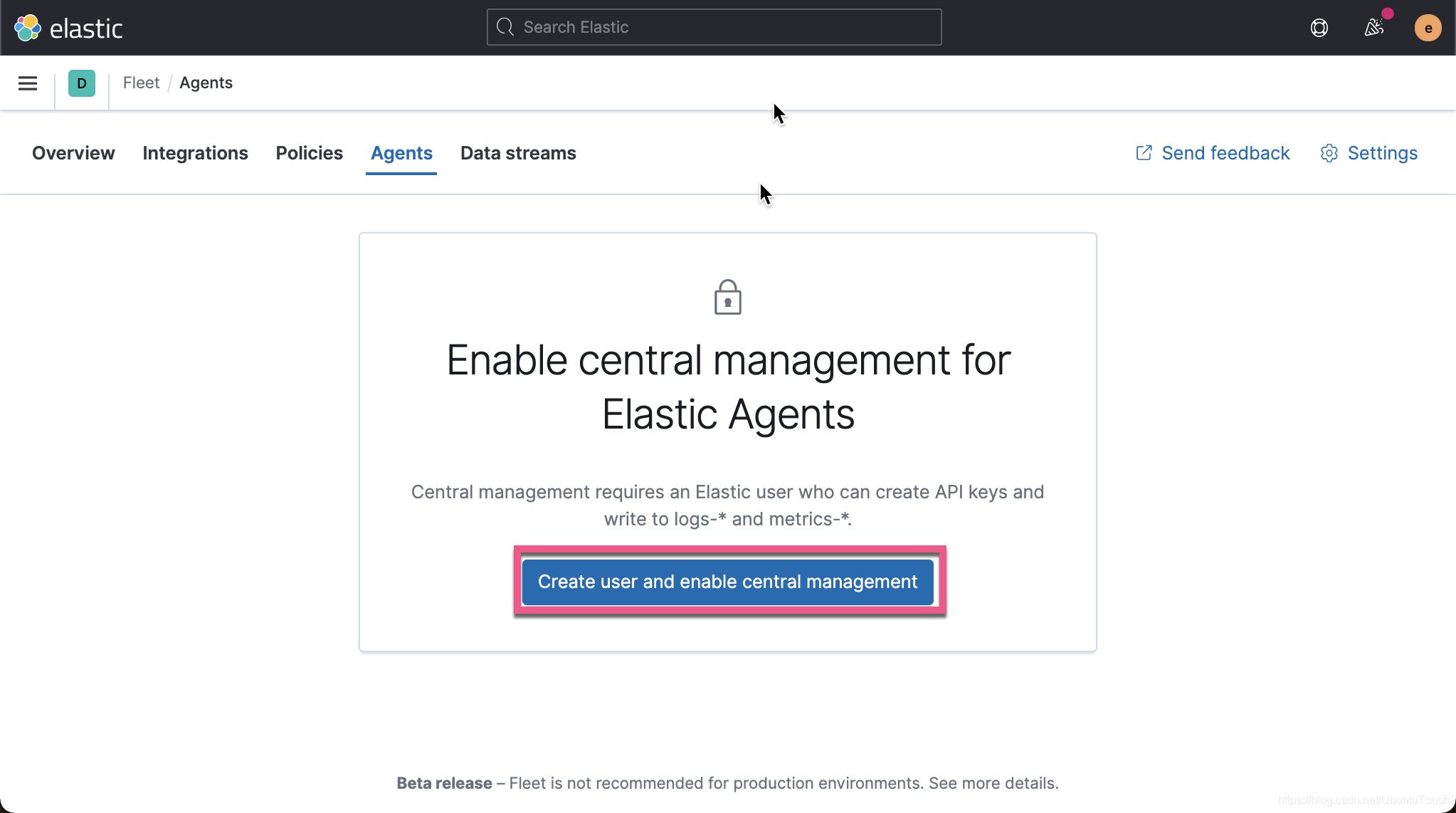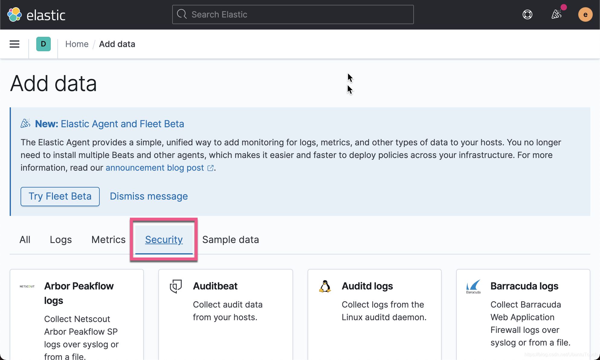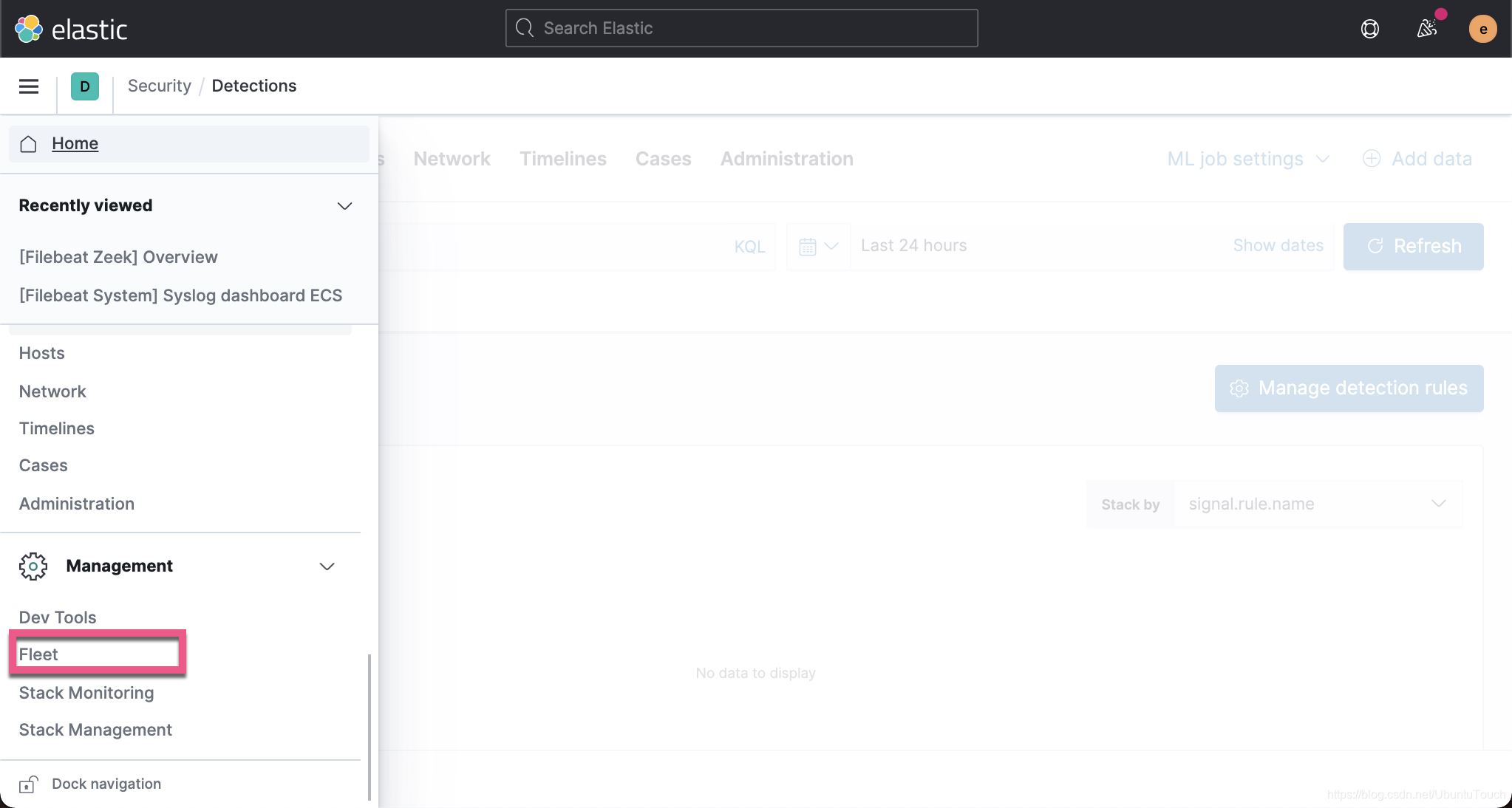 現(xiàn)在,我們準(zhǔn)備安裝 Elastic endpoint。首先,通過單擊側(cè)面菜單上管理標(biāo)簽下的鏈接,導(dǎo)航到 “Fleet” 儀表板。