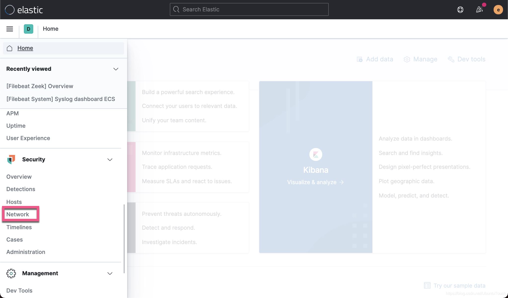 我們可以通過 Filebeat 把 Zeek 的日志信息導(dǎo)入到 Elasticsearch 中去。首先,我們必須啟動 zeek 模塊。我們打開 Kibana 的界面:
