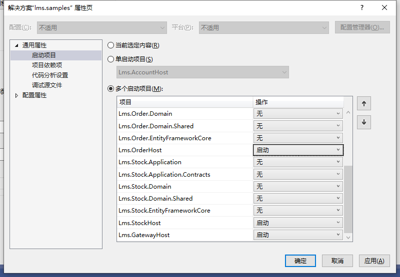 進(jìn)入到samples目錄下,使用visual studio打開lms.samples.sln解決方案,將項目設(shè)置為多啟動項目,并將網(wǎng)關(guān)和各個模塊的微服務(wù)主機(jī)設(shè)置為啟動項目,如下圖: