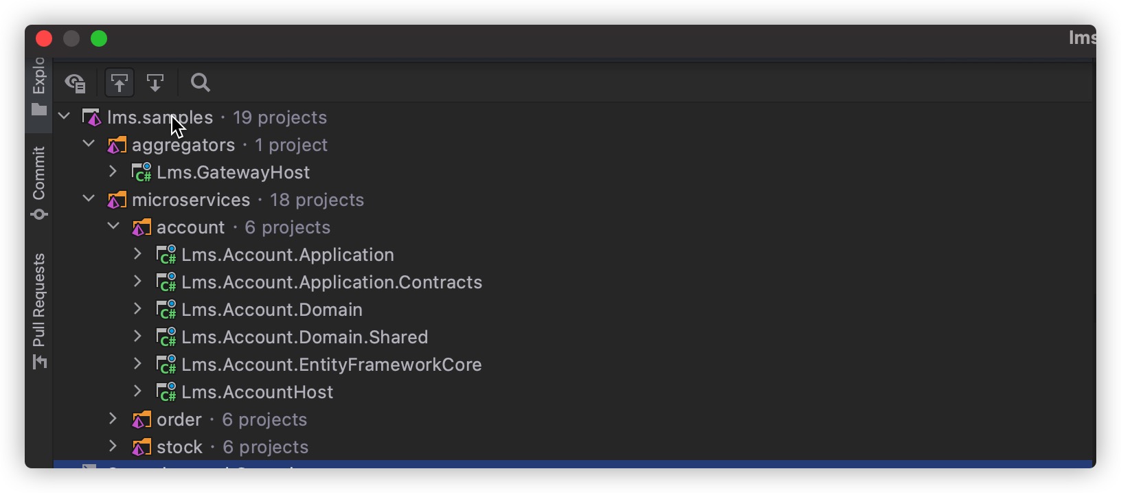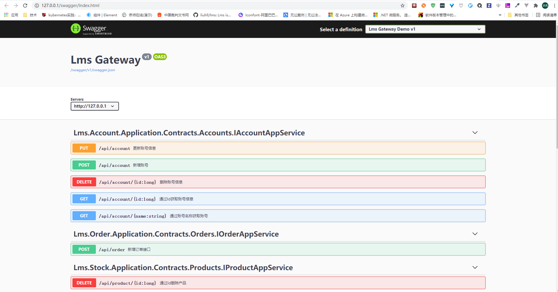 lms.sample項目由三個獨(dú)立的微服務(wù)應(yīng)用模塊組成:account、stock、order和一個網(wǎng)關(guān)項目gateway構(gòu)成。