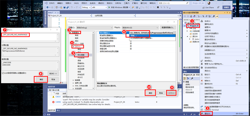 (1)我們只需要在VS中加入 _CRT_SECURE_NO_WARNINGS 這個(gè)宏就可以了,具體操作如下圖所示: