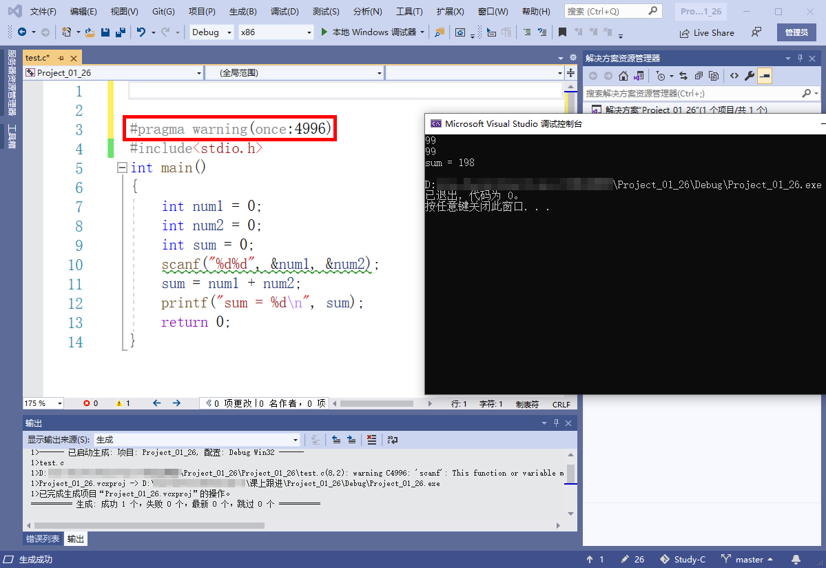 在C語言程序開頭添加代碼: #pragma warning(once:4996)//僅顯示一個(gè)